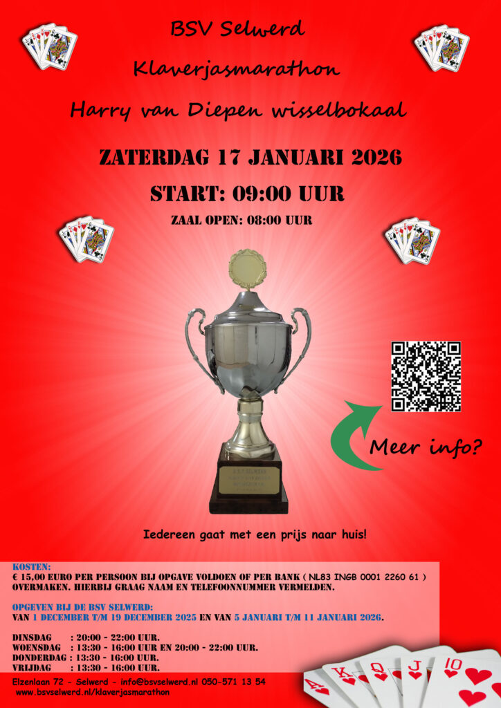 Jaarlijks organiseren we in de BSV Selwerd de “Harry van Diepen Wisselbokaal” klaverjasmarathon. Het leuke is dat iedere deelnemer met een prijs naar huis gaat. Dus kom gezellig kaarten en nodig uw partner, vriend, vriendin, buurman of buurvrouw uit om mee te doen. Hoe meer mensen er meedoen, hoe groter het plezier.